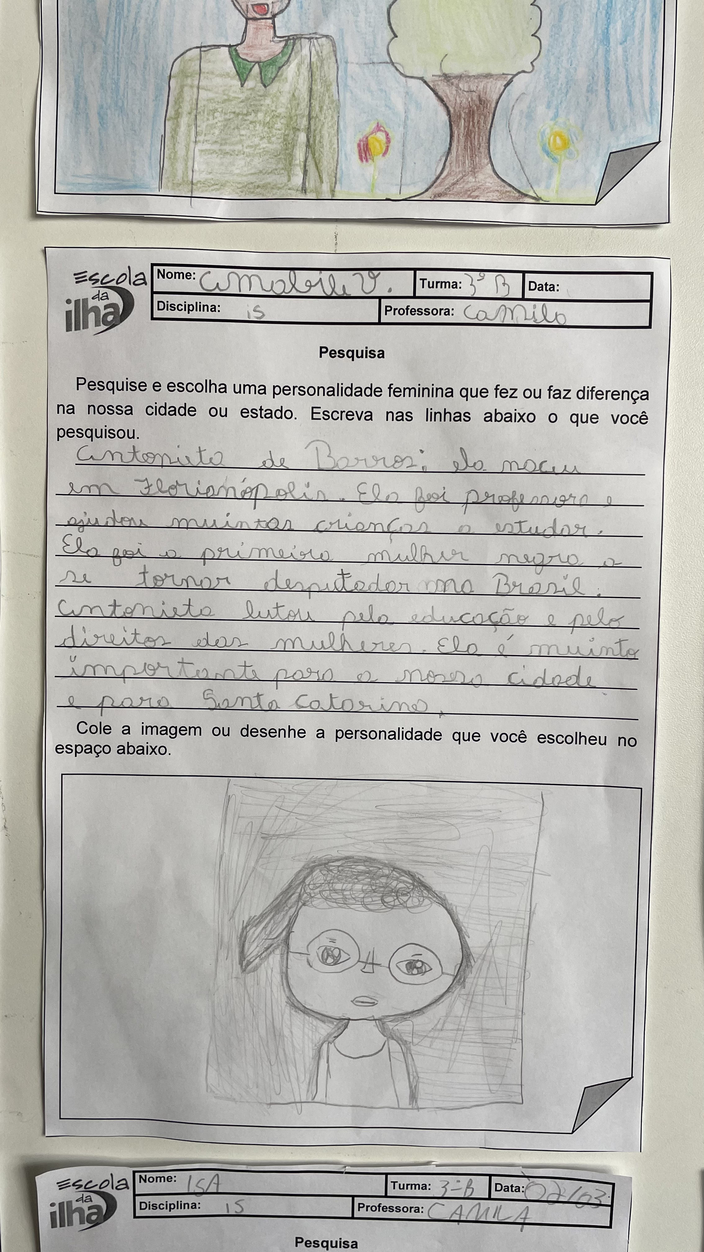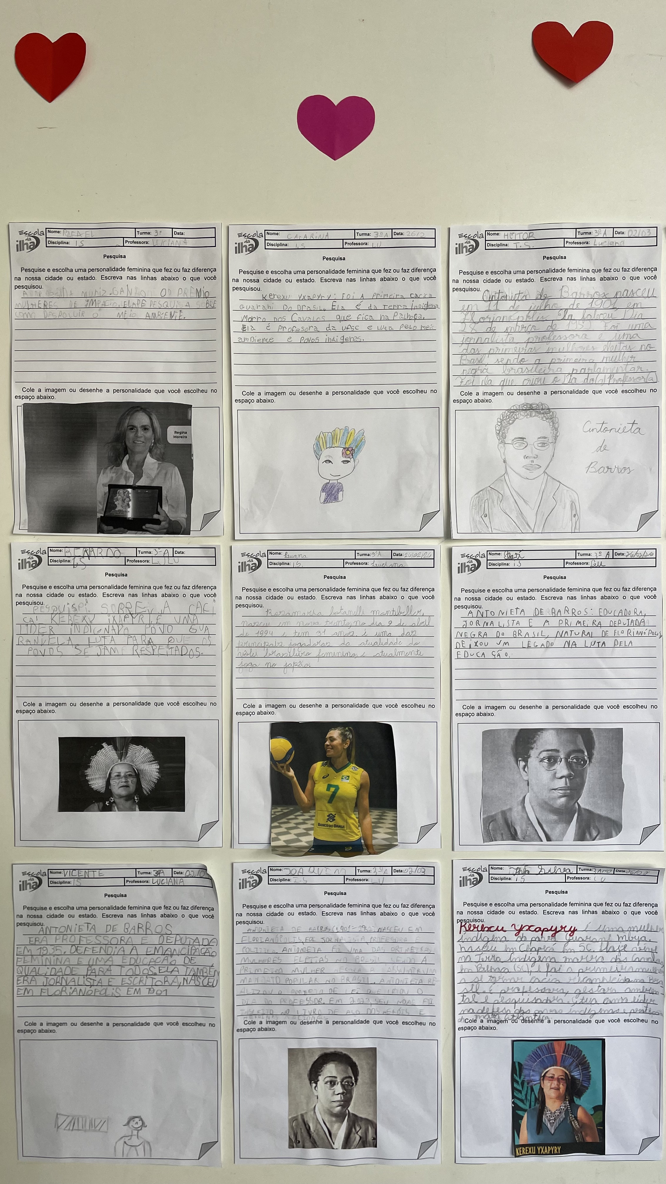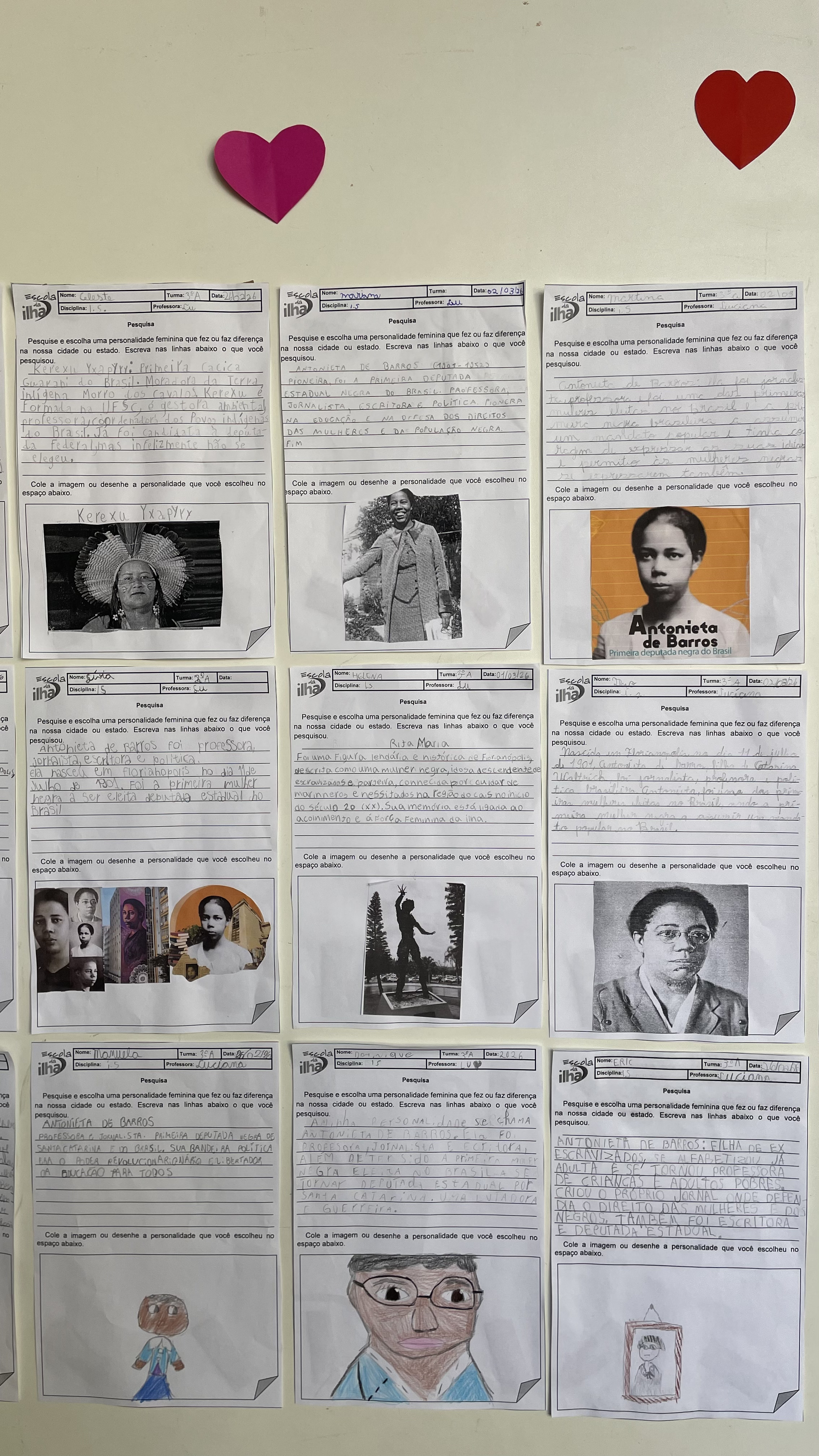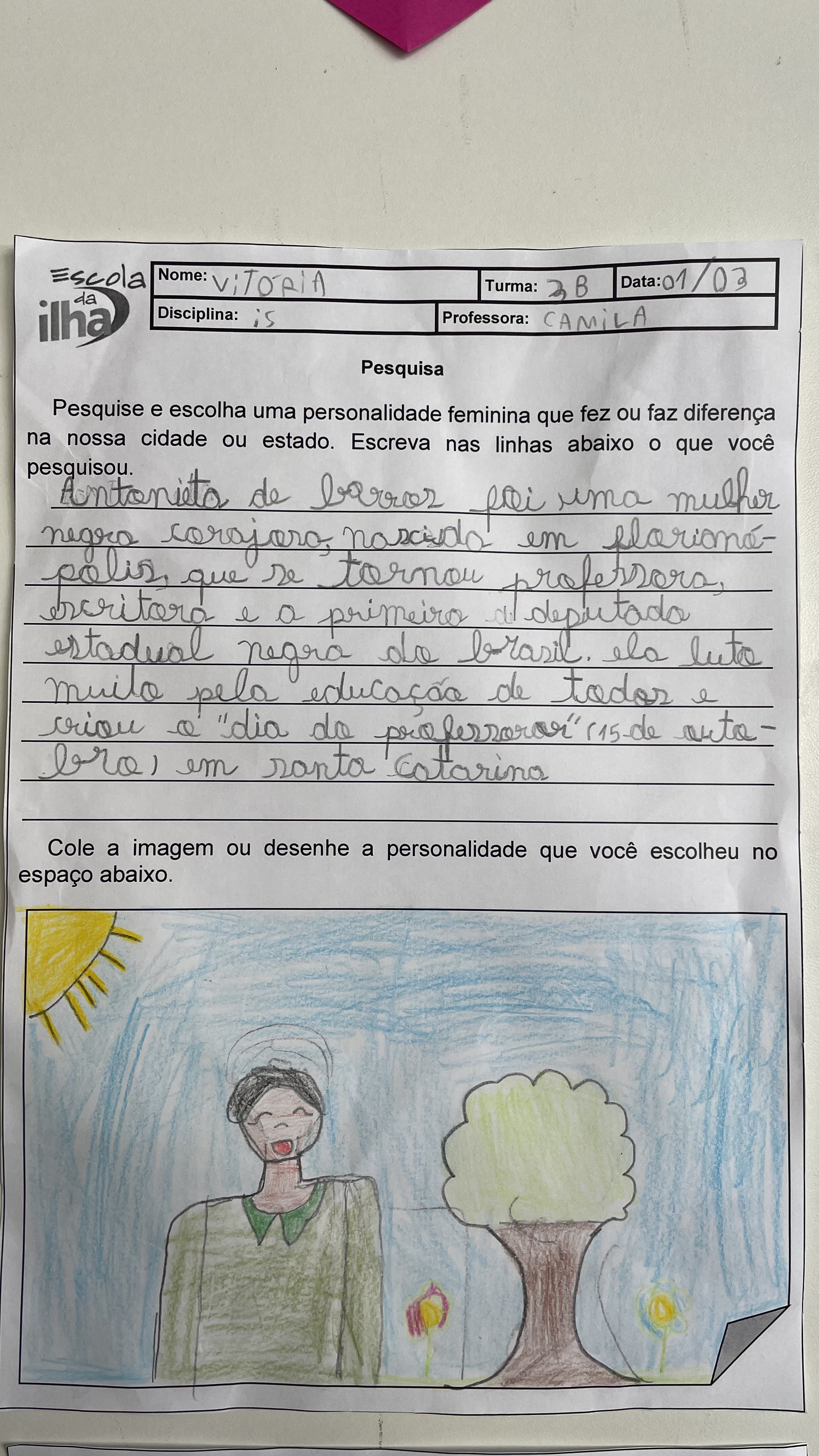 No mês da mulher, os 3º anos da Escola da Ilha realizaram um trabalho sobre mulheres que fizeram história. Entre elas, um nome apareceu diversas vezes nas pesquisas das crianças: Antonieta de Barros. Nascida em Florianópolis em 1901, ela foi professora, jornalista e se tornou a primeira mulher negra a assumir um mandato parlamentar no Brasil. Nos trabalhos, os estudantes trouxeram trechos de suas pesquisas sobre Antonieta de Barros, reunindo informações que ajudam a contar a trajetória da educadora catarinense.