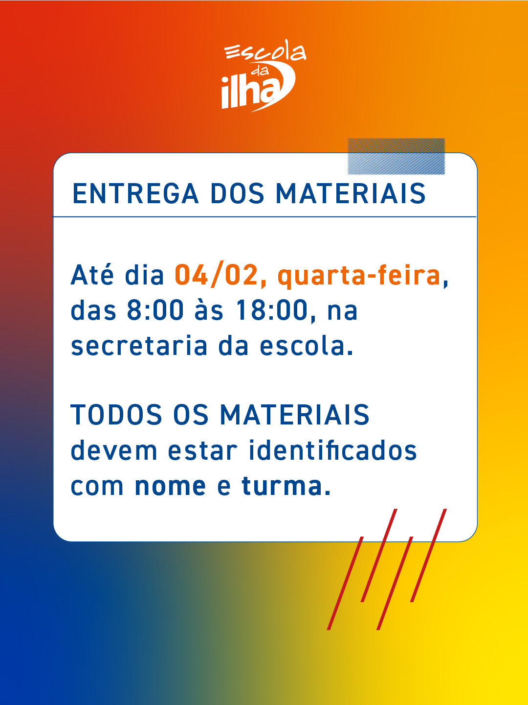 A entrega de materiais acontece até dia 04/02 das 8:00 às 18:00. Dia 05/02, os alunos voltam às aulas. Para o Infantil e o Fundamental 1, as reuniões de apresentação dos professores acontecem antes da volta às aulas: